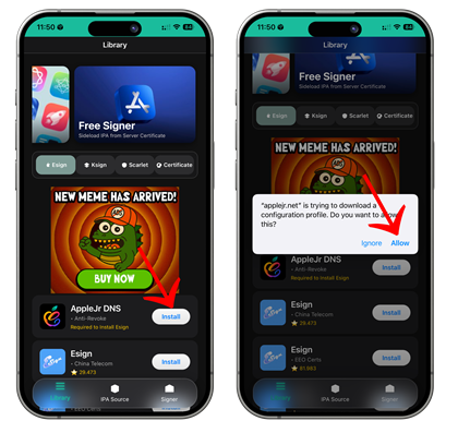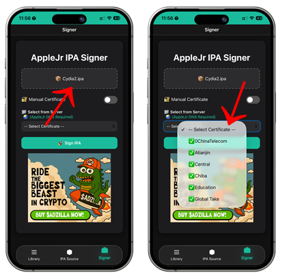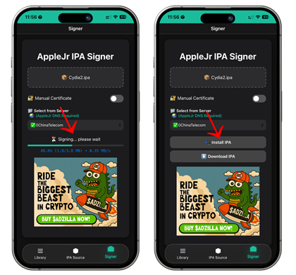 Tap the App Signer tab at the bottom, upload your desired IPA file, select a valid certificate, and tap Sign IPA to begin installation.