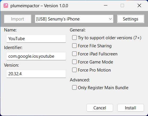 PlumeImpactor is available for macOS, Windows, and it uses your Apple ID to sign IPAs with a free 7-day certificate. Before installing, you can customize the app name, bundle ID, version, and compatibility options. With a lightweight UI and full cross-platform support, it feels smoother than AltStore while giving you advanced control over the final IPA.